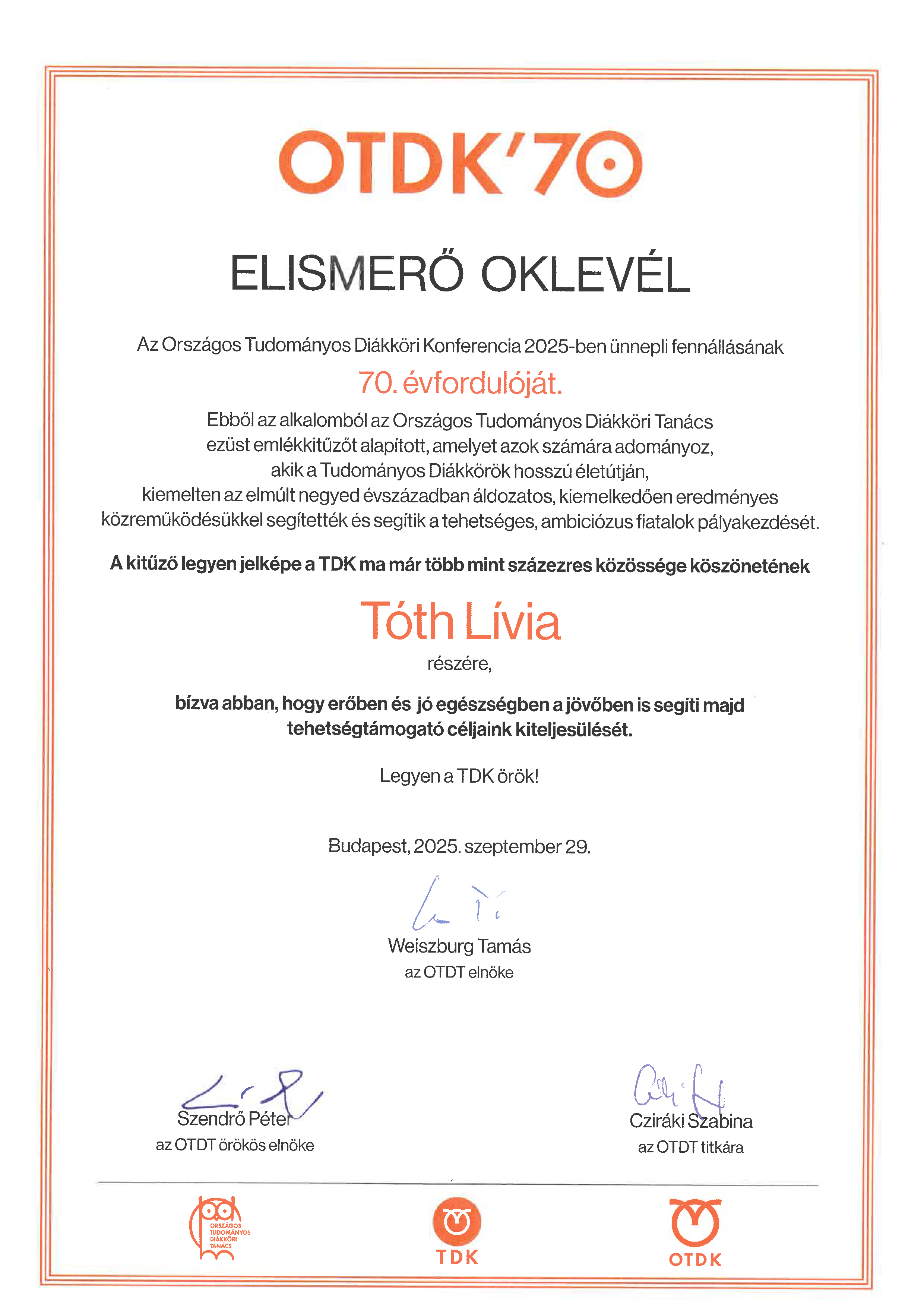 OKLEVÉL | OTDK'70